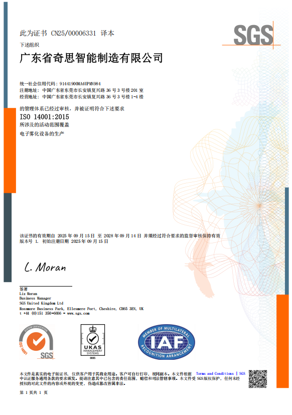 ISO14001环境管理体系认证要求企业建立系统化的环境管理机制,全面识别、监控并降低运营对环境的负面影响。广东奇思在生产过程中积极践行绿色理念,通过引进节能设备、优化产线资源利用、规范废弃物处理等方式,切实降低能耗与排放,实现经济效益与环境效益协同提升。此次认证的取得,表明公司已建立起科学、可追溯的环境管理流程,为持续推进绿色制造奠定了体系基础。