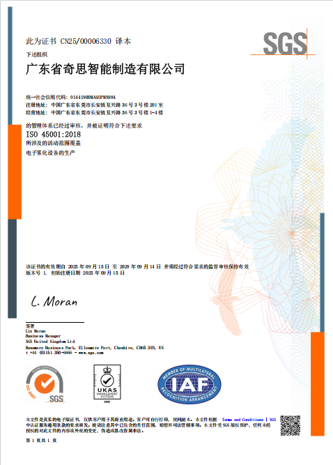 近日,基克纳全资子公司广东省奇思智能制造有限公司(下称 “广东奇思”)传来喜讯 —— 广东奇思顺利通过国际知名第三方机构SGS 审核,成功获得 ISO14001 环境管理体系和 ISO45001 职业健康安全管理体系双认证!此次认证的通过,是对广东奇思在环境保护、安全生产和员工健康管理方面系统化、规范化工作的充分肯定,也标志着公司在可持续发展道路上继续坚实迈进。